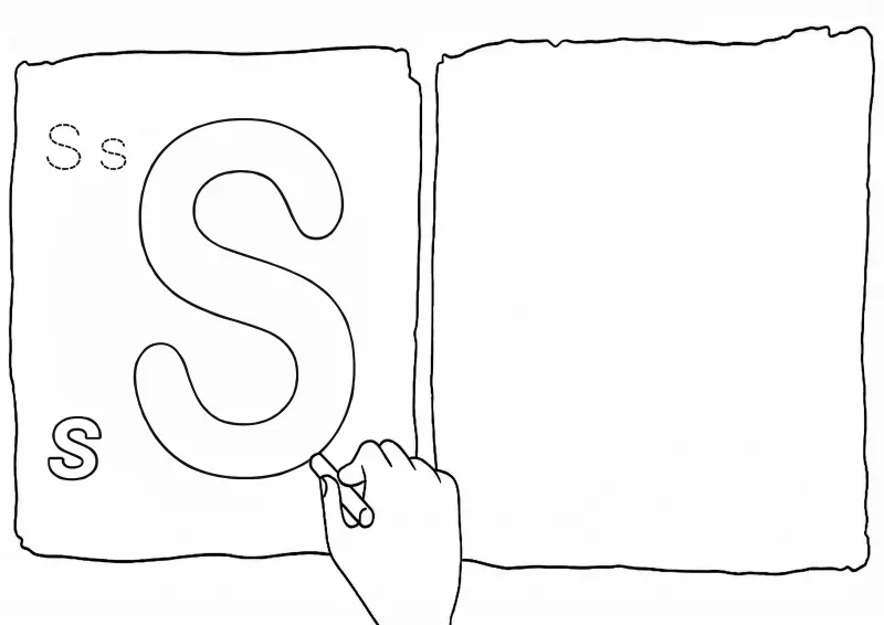 🔤AlfabetoEsta página de atividades educativa é dedicada ao ensino da letra S, apresentando um design ideal para crianças em fase de alfabetização. O desenho destaca a letra "S" em um formato de contorno grande para colorir, acompanhada por modelos pontilhados para treino de traçado e versões em caixa alta e baixa. A ilustração mostra uma mão segurando um giz sobre uma folha de papel com bordas rústicas, simulando um caderno de exercícios práticos. É um recurso pedagógico excelente para o desenvolvimento da coordenação motora fina e para o reconhecimento visual e escrito das letras do alfabeto.