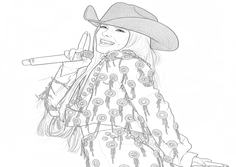 🐂Ana CastelaIlustração em traço artístico inspirada em Ana Castela sorrindo no palco, segurando o microfone com atitude e presença marcante. O desenho evidencia o brilho da artista, o figurino sertanejo icônico e a conexão direta com o público, representando a força feminina e o sucesso do sertanejo moderno.