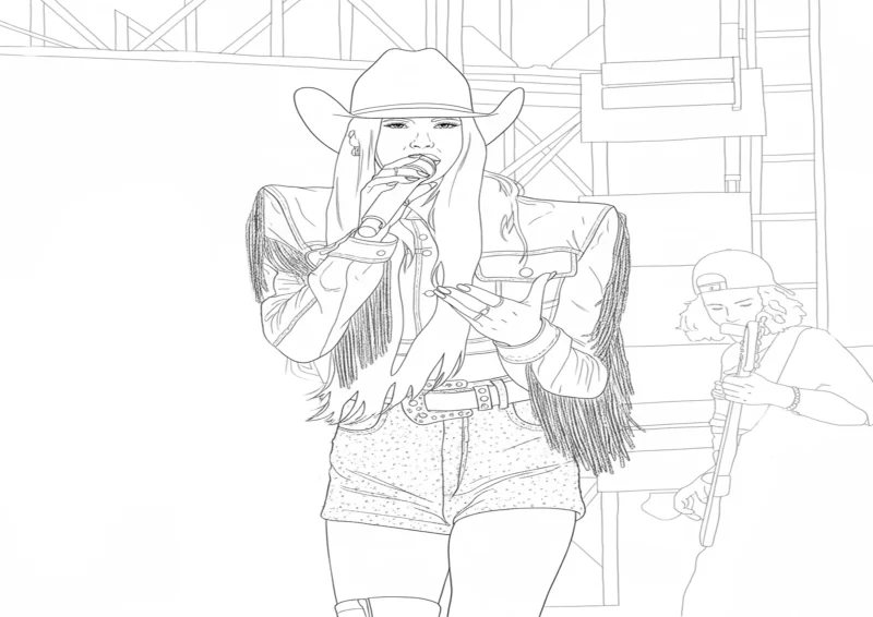 🐂Ana CastelaDesenho inspirado em Ana Castela, a boiadeira, se apresentando no palco com seu chapéu e microfone na mão. Ideal para fãs da cantora sertaneja que querem colorir e expressar sua criatividade com arte e música.