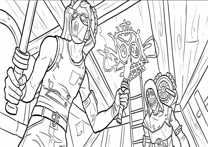 🉑ArcaneIlustração dinâmica mostrando membros da gangue Fogo-Volante (Firelights) em ação. O desenho destaca dois personagens mascarados segurando bastões e tochas, com o símbolo da coruja dos Firelights grafitado na parede de madeira ao fundo. Cena rica em detalhes de cenário e vestuário "steampunk" de Zaun.