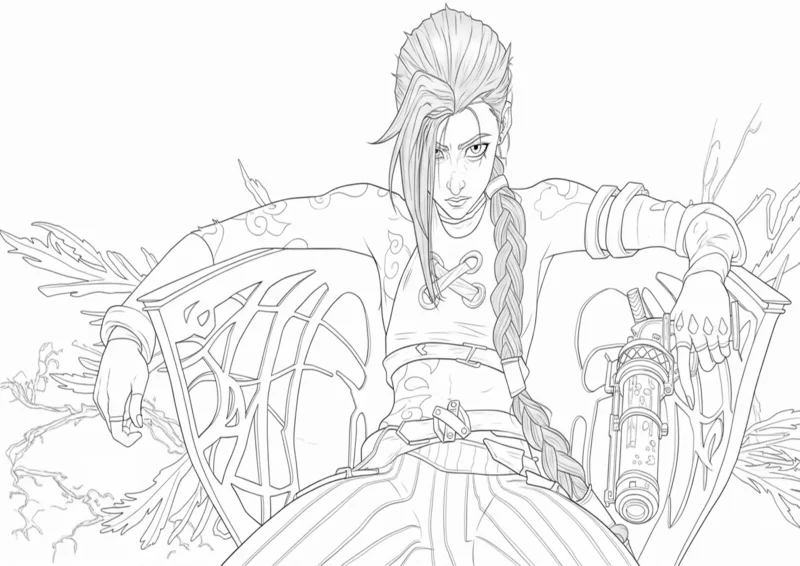 🉑ArcaneDesenho incrível da personagem Jinx de Arcane, mostrando sua postura confiante e olhar determinado. Arte em estilo line art perfeita para colorir, destacando detalhes como suas tatuagens, trança longa e o visual rebelde característico. Ideal para fãs de Arcane e League of Legends que amam desenhos detalhados e cheios de atitude.