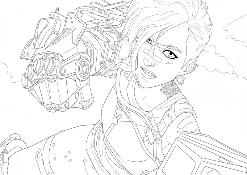🉑ArcaneDesenho para colorir da personagem Jinx de Arcane em pose intensa, mostrando sua luva mecânica detalhada e expressão determinada. Ideal para fãs de Arcane e League of Legends que curtem artes de ação e estilo marcante para colorir.