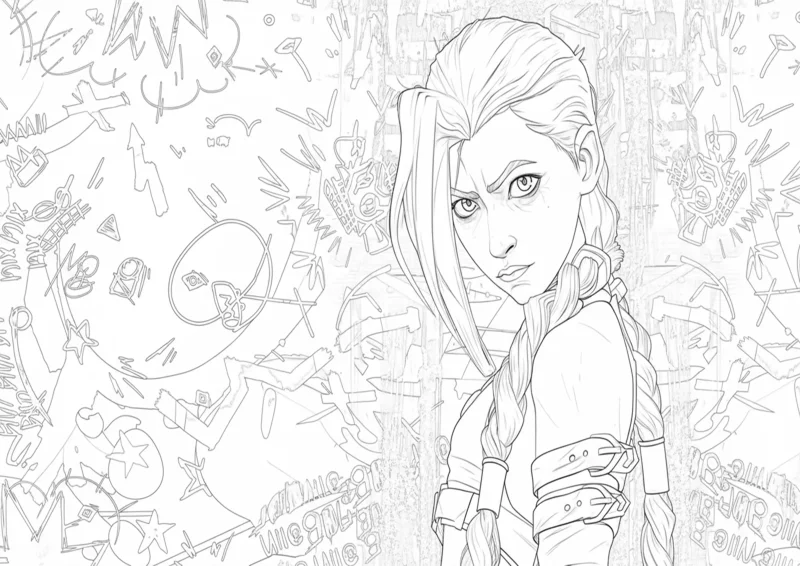 🉑ArcaneDesenho detalhado em preto e branco da personagem Vi da série Arcane, com fundo cheio de grafites e símbolos característicos. Uma arte ideal para fãs que desejam colorir cenas inspiradas no universo de Arcane e League of Legends, destacando a força e atitude da personagem.