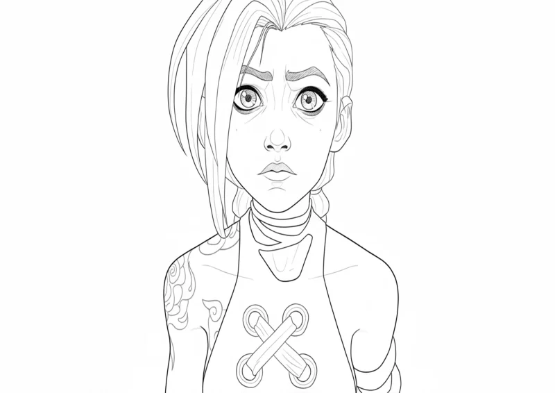 🉑ArcaneDesenho em linha minimalista retratando Vi ainda jovem da série Arcane, com expressão inocente e traços finos em preto e branco. Ideal para fãs que gostam de arte digital e ilustrações para colorir inspiradas no universo de Arcane e League of Legends.