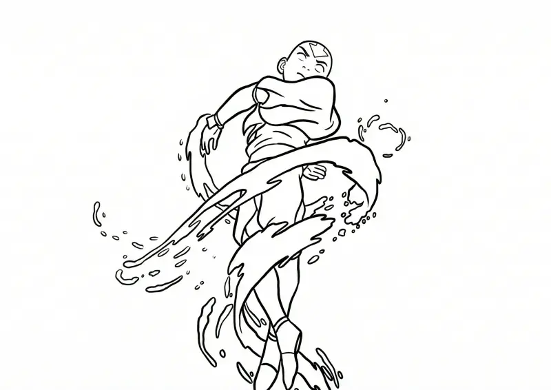 ☯️Avatar O Último Mestre do ArUma ilustração em estilo de arte de linha (line art) apresentando o personagem Aang, do desenho Avatar: A Lenda de Aang. Nesta cena dinâmica, Aang aparece em uma pose de movimento fluido, executando a dobra de água. Redemoinhos e jatos de água circulam seu corpo, com gotas e respingos detalhados que trazem sensação de ação. O desenho possui contornos pretos nítidos e bem definidos, com o interior totalmente branco, ideal para atividades de colorir infantis ou para fãs da série que buscam praticar técnicas de pintura digital ou manual.