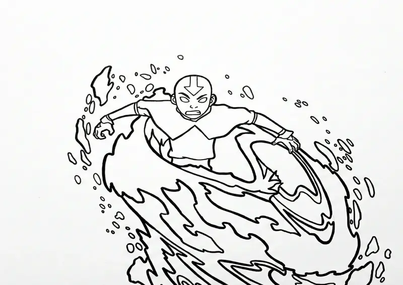 ☯️Avatar O Último Mestre do ArUma ilustração épica em preto e branco focada em SEO para o seu projeto de e-books educativos. A imagem apresenta o personagem Aang, da série Avatar: A Lenda de Aang, manifestando o poderoso "Estado Avatar". Ele é retratado em uma pose de comando centralizada, envolto por elementos de energia e esferas elementais em movimento dinâmico. O desenho segue o estilo Bob Good inspirado, com linhas pretas grossas e contornos nítidos, sem sombreamento e com o interior totalmente branco para facilitar a pintura por crianças pequenas.
