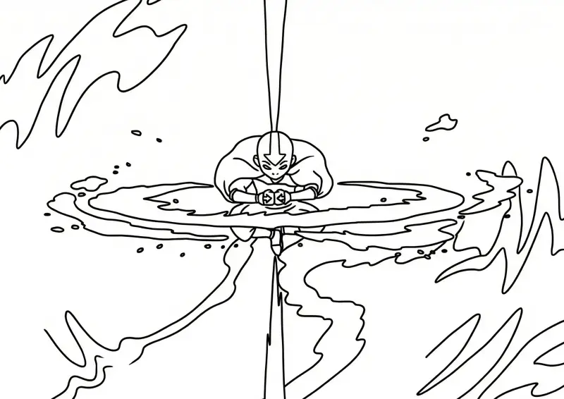 ☯️Avatar O Último Mestre do ArDesenho impactante de Aang entrando no poderoso Estado Avatar. A ilustração mostra o jovem Avatar flutuando em posição de meditação ativa, cercado por anéis de energia e elementos giratórios. Feixes de luz verticais atravessam o centro da imagem, simbolizando a conexão espiritual e o poder cósmico. O desenho possui linhas pretas bem definidas e fundo branco, permitindo que quem for colorir explore efeitos de luz nas tatuagens de seta e nos elementos (ar, água, terra e fogo) ao redor.