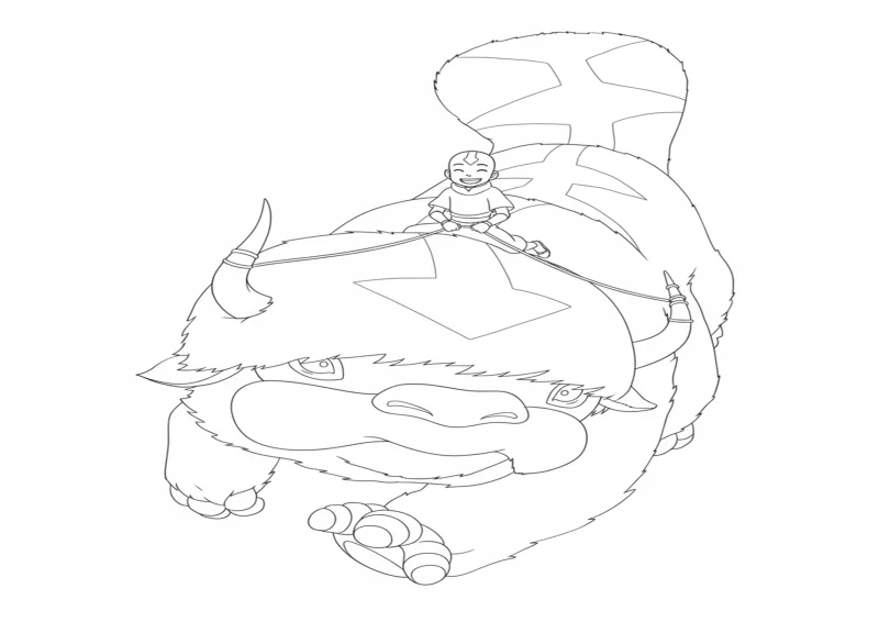 ☯️Avatar O Último Mestre do ArAppa no ar com a boca aberta, cauda balançando, Aang pequeno em sua sela.