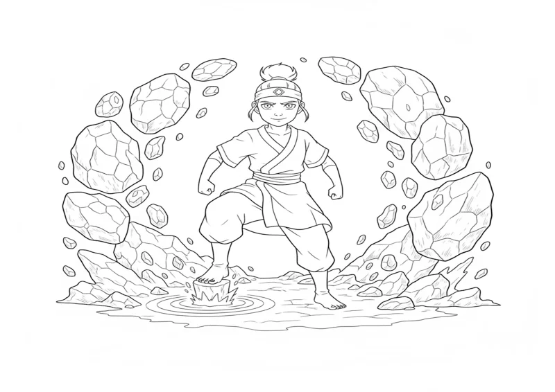 ☯️Avatar O Último Mestre do ArToph golpeando o chão com o pé, pedaços de pedra se levantando em torno dela.