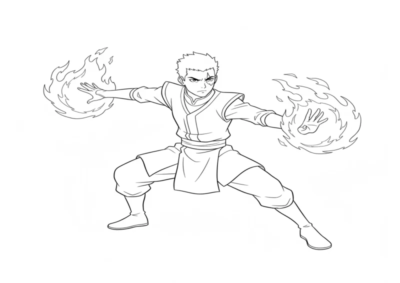 ☯️Avatar O Último Mestre do ArZuko sério em posição de combate, segurando fogo nas mãos.