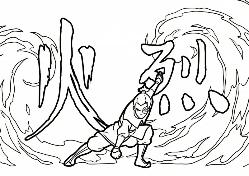 ☯️Avatar O Último Mestre do ArUma ilustração poderosa em estilo line art do Príncipe Zuko, da Nação do Fogo. Zuko é retratado em uma base de combate baixa e estável, executando uma técnica de dobra de fogo com movimentos precisos dos braços. Ao fundo, grandes labaredas e símbolos caligráficos orientais reforçam a temática da Nação do Fogo. O desenho mantém o padrão do projeto: contornos pretos nítidos, traço limpo inspirado em Bob Good e interior totalmente branco, proporcionando uma experiência de pintura fluida e profissional para crianças e fãs de anime.