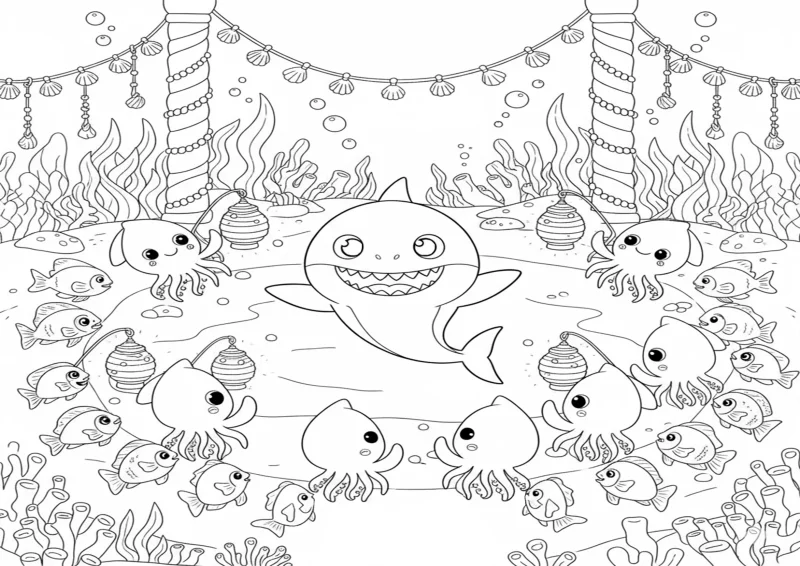 🦈Baby SharkBaby Shark dançando em uma festa submarina, com lulas soltando luzes como lanternas e peixes batendo palmas.