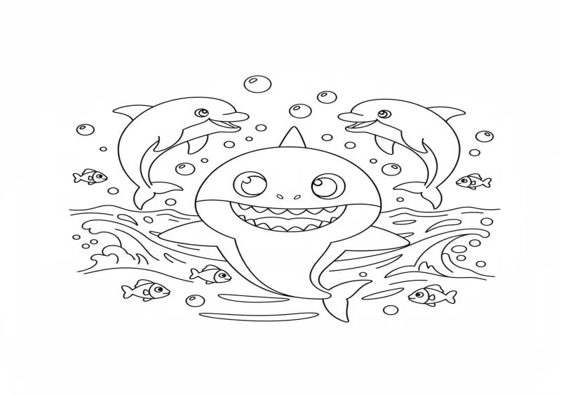 🦈Baby SharkBaby Shark nada ao lado de dois golfinhos saltando e fazendo piruetas dentro da água.