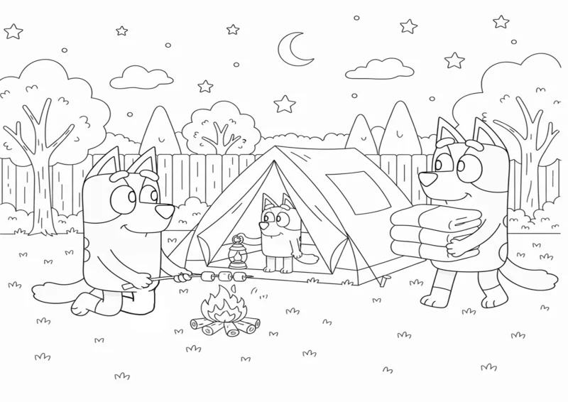 🐶BlueyBluey dentro de uma barraca no quintal, segurando o lampião, enquanto Bandit assa marshmallows em uma fogueira pequena e Chilli traz cobertores.
