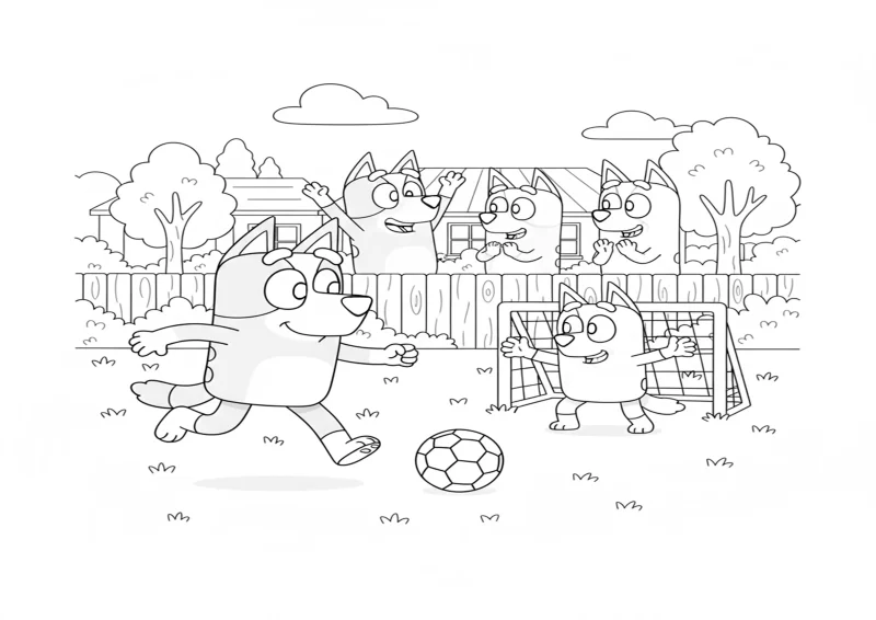 🐶BlueyBluey chutando uma bola de futebol enquanto Bingo tenta defender como goleiro, os vizinhos torcendo animados ao fundo.