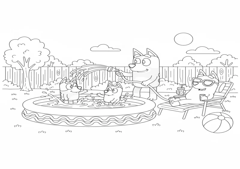 🐶BlueyBluey e Bingo brincando em uma piscina inflável no quintal, respingando água, enquanto Bandit segura uma mangueira e Chilli usa óculos de sol relaxando em uma cadeira.