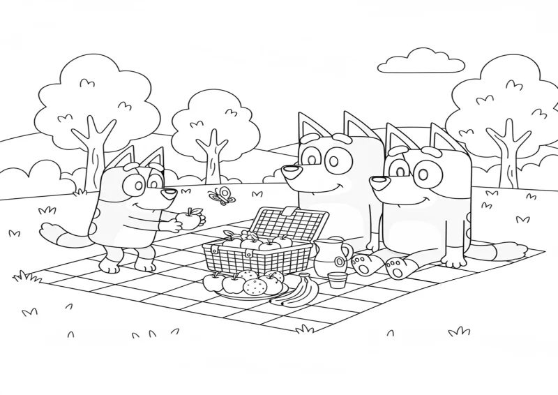 🐶BlueyA família Heeler sentada em um cobertor no parque, com cesta de piquenique aberta, frutas e sucos espalhados, enquanto Bluey corre atrás de uma borboleta.
