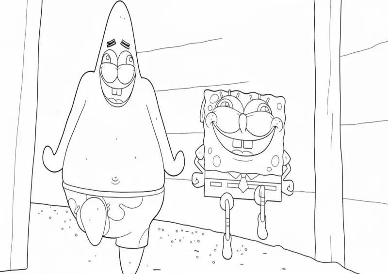 🧽Bob EsponjaDesenho para colorir dos melhores amigos Bob Esponja e Patrick Estrela sorrindo e caminhando juntos. Inspirado em momentos icônicos de Bob Esponja: Em Busca da Calça Quadrada, este desenho celebra a amizade e é excelente para atividades escolares ou em casa.