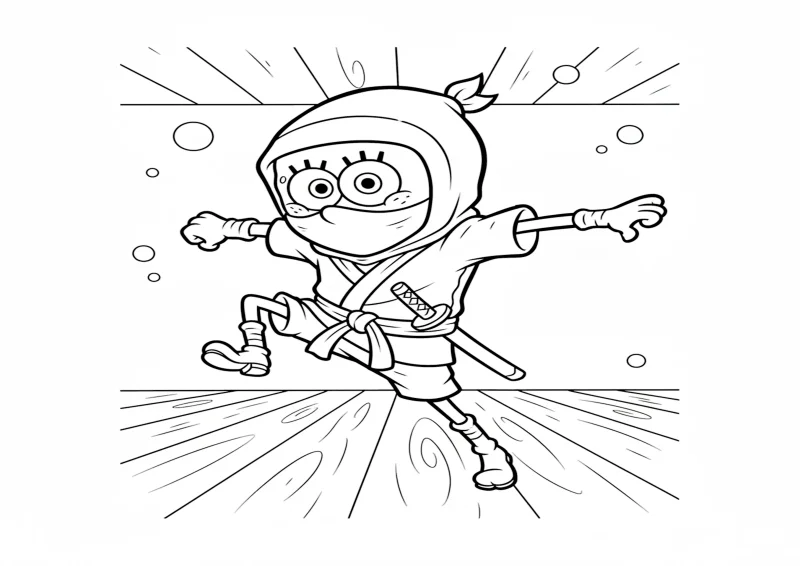 Bob Esponja vestido de ninja pulando no ar com pose de ataque.
