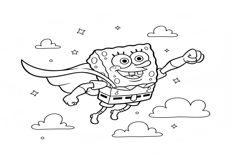 Bob Esponja com capa esvoaçante voando alto como super-herói.