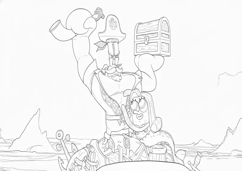 🧽Bob EsponjaDesenho para colorir do Seu Siriguejo em uma versão musculosa de pirata, segurando um baú de tesouro e um berrante. A cena, ambientada em um navio, mostra o personagem protegendo suas riquezas conforme visto no filme do Bob Esponja.