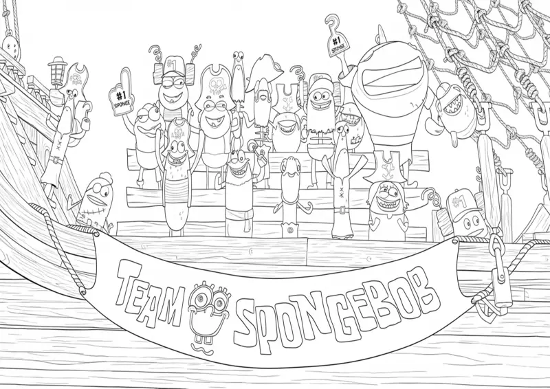 🧽Bob EsponjaDesenho para colorir com vários personagens da Fenda do Biquíni reunidos em um navio com a faixa "Team Spongebob". Uma ilustração épica e cheia de detalhes do filme Bob Esponja: Em busca da calça quadrada.