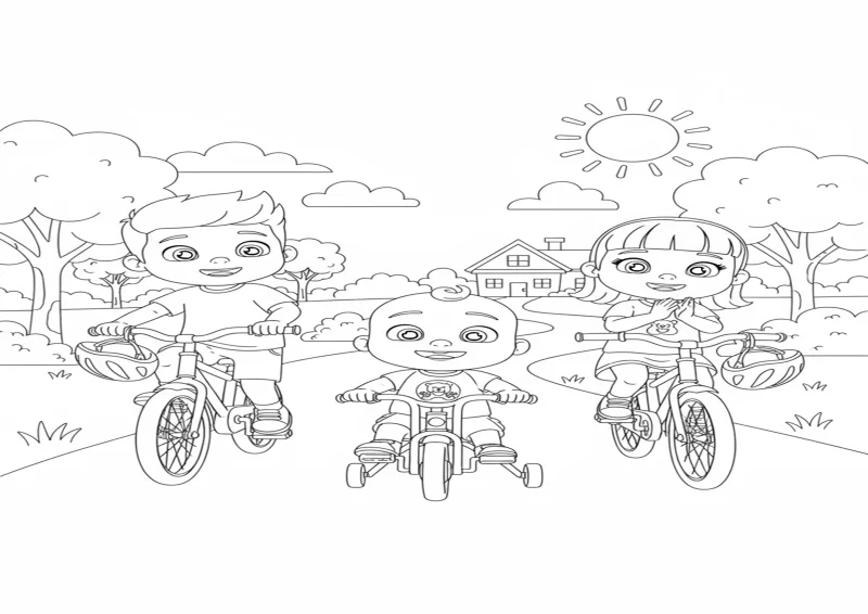 🍄CoComelonJJ pedala sua bicicleta com rodinhas enquanto TomTom e YoYo pedalam ao lado em bicicletas maiores.