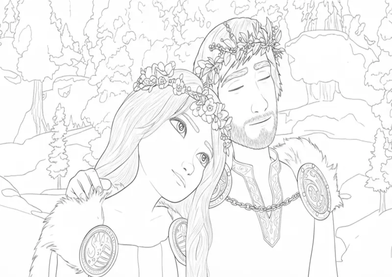 🔥Como Treinar Seu DragãoDesenho para colorir da linda cena do casamento de Soluço e Astrid. A ilustração mostra o casal feliz usando coroas de flores e trajes cerimoniais no final emocionante de Como Treinar Seu Dragão 3: O Mundo Oculto. Perfeito para imprimir e celebrar a união dos vikings.