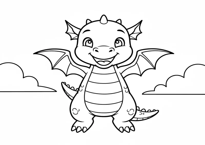 🐉DragõesUm dragão bebê tenta voar pela primeira vez, com asas pequenas abertas e expressão alegre, nuvens minimalistas ao redor.