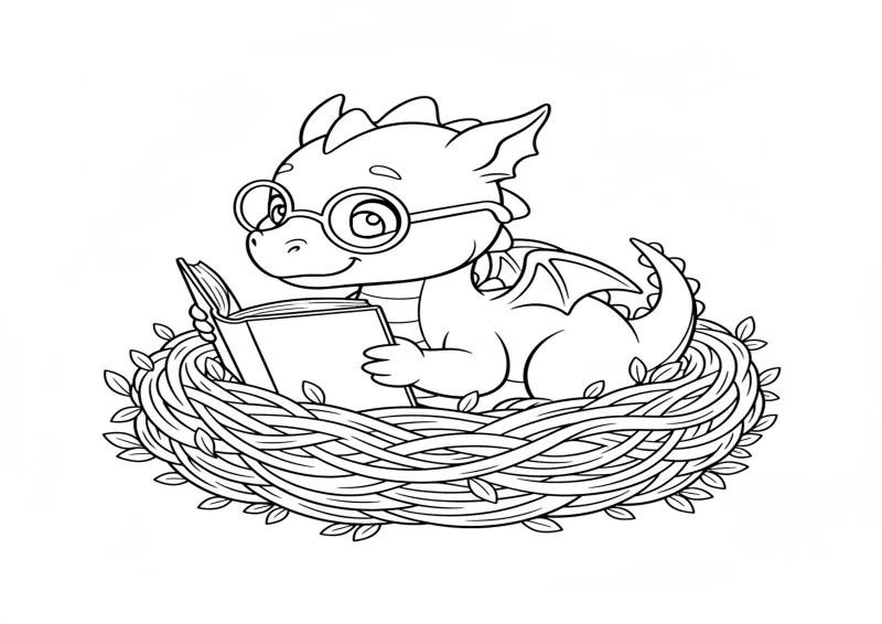 🐉DragõesUm dragão fofo deitado lendo um livro grande, com óculos imaginários e páginas virando em linhas simples.