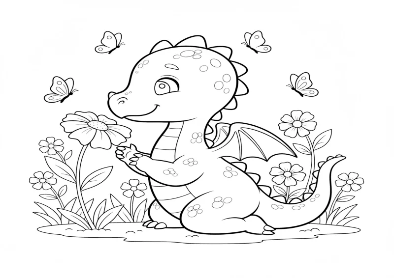 🐉DragõesUm dragão cheirando flores em um jardim, com borboletas em linhas simples voando ao redor.