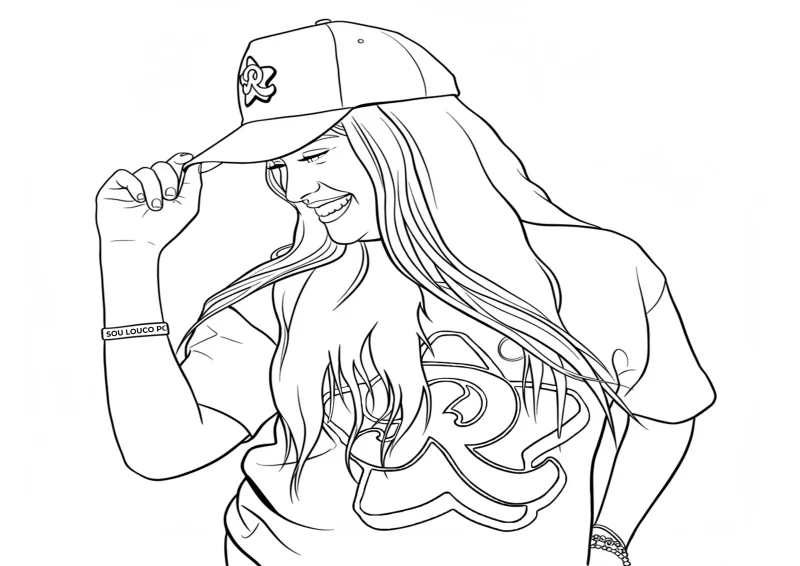 ®️Emilly Vick e os RosasDesenho minimalista de Emilly Vick sorrindo com um boné e camiseta estilizada. Arte em linha preta ideal para colorir, destacando sua alegria e estilo descontraído.