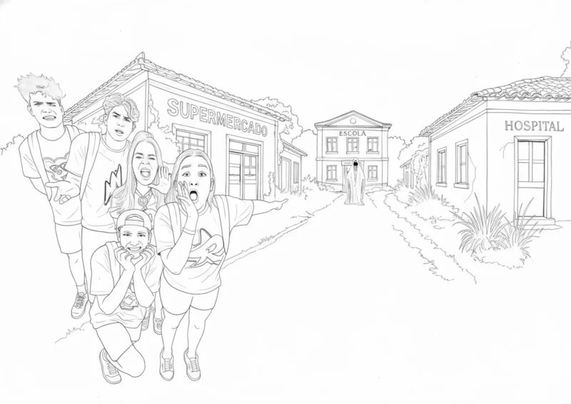 ®️Emilly Vick e os RosasIlustração em line art reunindo os personagens Emily Vick, Leozinho, Void, Robson e Katlen em uma cena urbana com clima de suspense e surpresa. O grupo reage a uma figura misteriosa ao fundo, em um cenário que inclui escola, supermercado e hospital, criando uma narrativa visual intensa e cinematográfica. A composição em preto e branco valoriza expressão, movimento e storytelling, tornando a obra ideal para projetos criativos, séries ilustradas, portfólios artísticos e coleções de arte digital contemporânea.