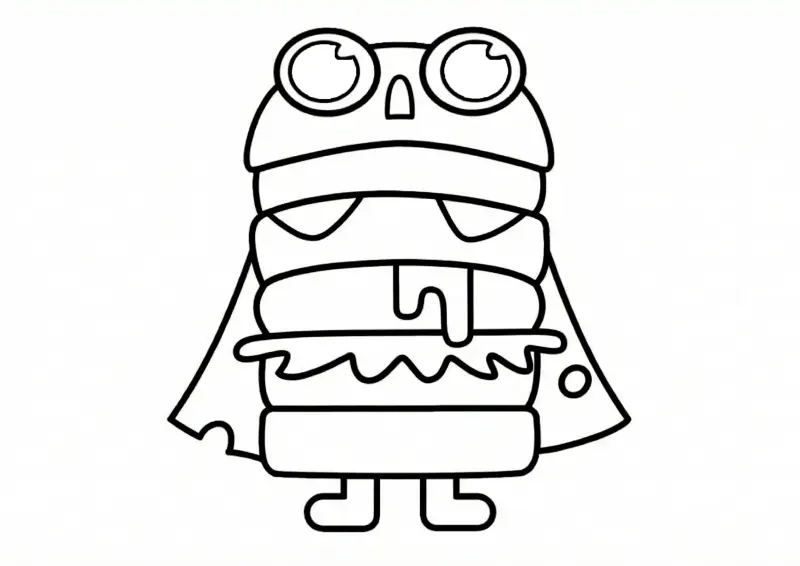 🤯EnaldinhoDesenho do personagem Burglet, da coleção Elo Monsters, em estilo de livro de colorir. O monstro possui a aparência divertida de um hambúrguer com camadas visíveis de pão, carne e queijo derretido. Ele usa uma capa nas costas que simula uma fatia de queijo com furos e possui grandes olhos redondos no topo da cabeça, parecidos com óculos de aviador. O desenho é feito com linhas pretas grossas e nítidas sobre fundo branco, perfeito para colorir.