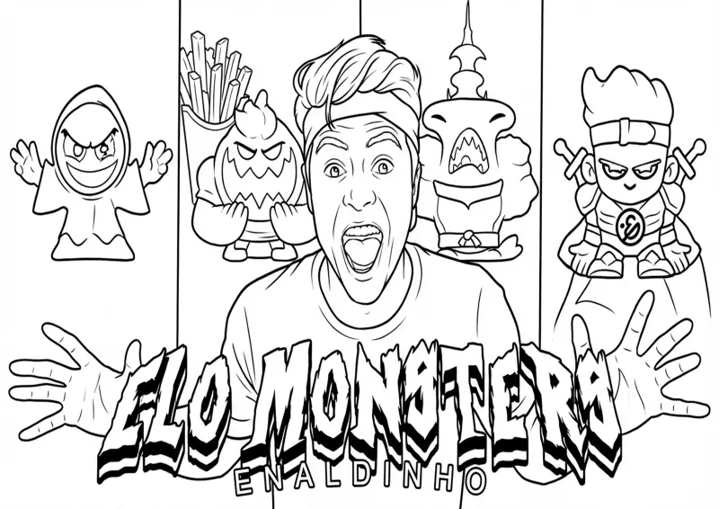 🤯EnaldinhoDesenho épico do Enaldinho rodeado pelos personagens Elo Monsters para imprimir e colorir. A cena apresenta o influenciador com expressão de surpresa e os monstros colecionáveis ao fundo, ideal para fãs da coleção e do canal.