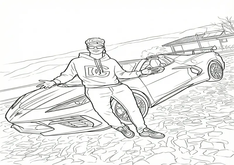 🤯EnaldinhoDesenho do Youtuber Enaldinho posando ao lado de seu famoso carro esportivo, um Corvette conversível. A imagem mostra Enaldinho encostado no capô do veículo com pose confiante, usando óculos escuros e moletom. O carro é representado com riqueza de detalhes, destacando as rodas esportivas, os faróis e o design aerodinâmico. O traço segue o estilo "outline" com linhas pretas nítidas e fundo branco, ideal para colorir tanto o personagem quanto o veículo.
