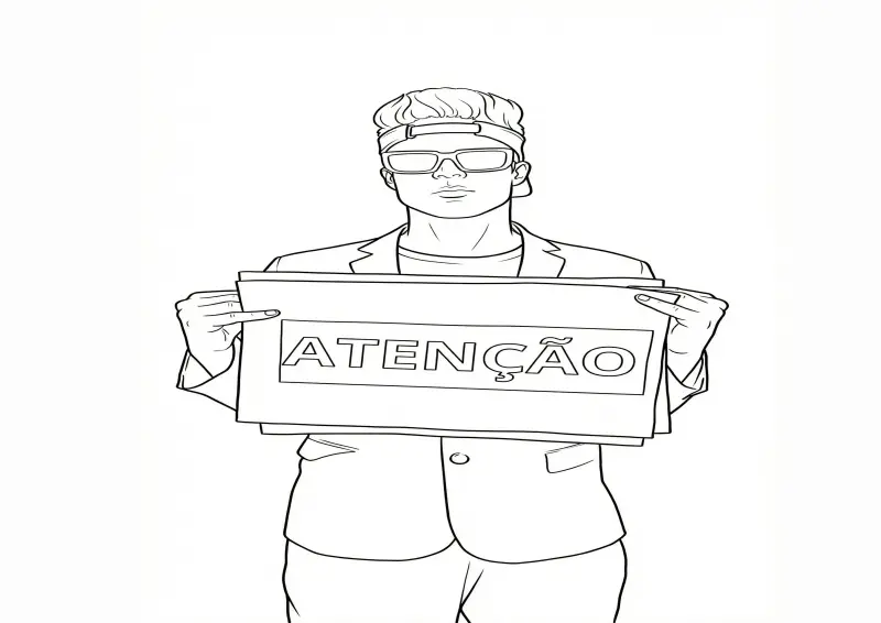 🤯EnaldinhoDesenho do influenciador Enaldinho em uma pose de comunicado urgente. Ele aparece vestindo um blazer sobre a camiseta e usando óculos escuros, segurando com as duas mãos uma grande placa horizontal onde está escrito "ATENÇÃO" em letras maiúsculas. A imagem remete às capas de vídeo de avisos importantes do canal, adaptada para o estilo de colorir com traços pretos nítidos e fundo branco.