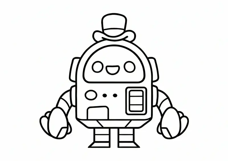 🤯EnaldinhoDesenho do personagem Robô Roudini, da coleção Elo Monsters, em estilo de livro de colorir. O personagem é um pequeno robô com design arredondado e tecnológico, usando uma cartola de mágico na cabeça (característica do Roudini). Ele possui braços mecânicos simples e uma expressão amigável na tela/rosto. O traço é "Bob Good inspired", com linhas pretas grossas e interior vazio para colorir.