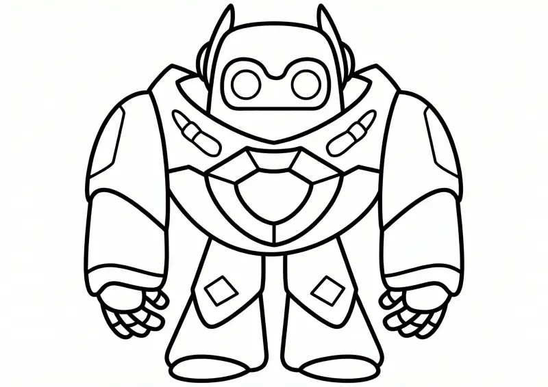 🤯EnaldinhoDesenho do personagem Rubbot-08, da coleção Elo Monsters do Enaldinho, em formato de livro de colorir. O personagem é um robô de aparência tecnológica e robusta (estilo tank), com um corpo arredondado e blindado, grandes olhos circulares que lembram óculos de proteção e antenas na cabeça. O design apresenta placas de armadura no peito e ombros largos, desenhados com linhas pretas nítidas e grossas ("Bob Good style") sobre fundo branco, ideal para colorir.