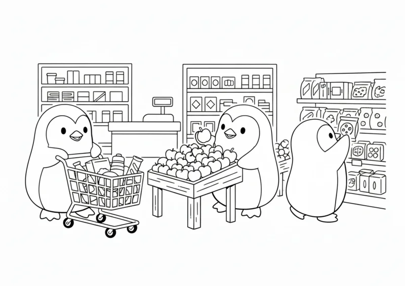 🧸Estilo MinimalistaDesenho fofo e engraçado de três pinguins fofinhos no supermercado, estilo minimalista em preto e branco.