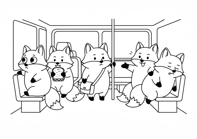 🧸Estilo MinimalistaDesenho divertido em preto e branco de cinco raposas fofinhas dentro de um ônibus, estilo Bob Good.