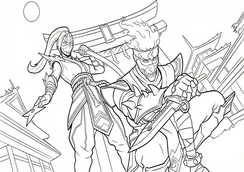 💥Free FireEsta ilustração em preto e branco apresenta os personagens Hayato e Kelly em suas skins de samurai e ninja do Free Fire. Em primeiro plano, Hayato aparece em uma pose de ataque dinâmica, empunhando uma espada curta (tantō) com detalhes de armadura e chamas saindo de sua cabeça. Ao fundo, a personagem feminina, possivelmente uma versão skin de Kelly ou Sakura, segura shurikens e uma katana, usando uma máscara de proteção. O cenário conta com elementos da arquitetura tradicional japonesa, como um portal Torii e templos, ideal para quem gosta de desenhos detalhados e orientais para colorir.