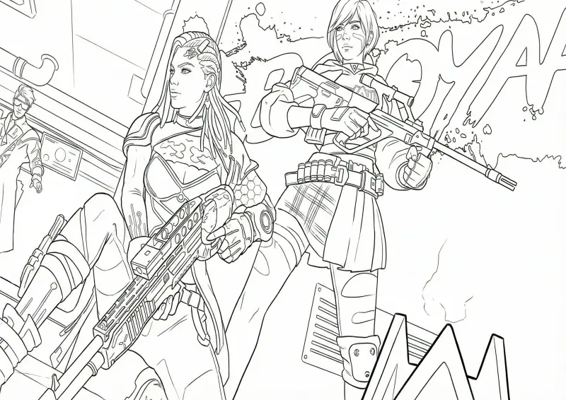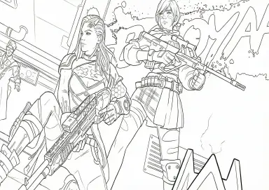 💥Free FireUma ilustração épica em estilo line art (contornos pretos e brancos) que reúne personagens icônicos do Free Fire. Em primeiro plano, à esquerda, vemos a hacker Moco segurando um rifle de precisão com detalhes tecnológicos. Ao centro, a personagem Kelly (The Swift) aparece empunhando uma metralhadora leve, vestindo sua clássica saia plissada e jaqueta. Ao fundo, o personagem Maxim é visível em um laboratório ou base militar. O desenho inclui a palavra "BOOYAH!" estilizada com efeitos de tinta ao fundo, criando uma cena clássica de vitória no Battle Royale.