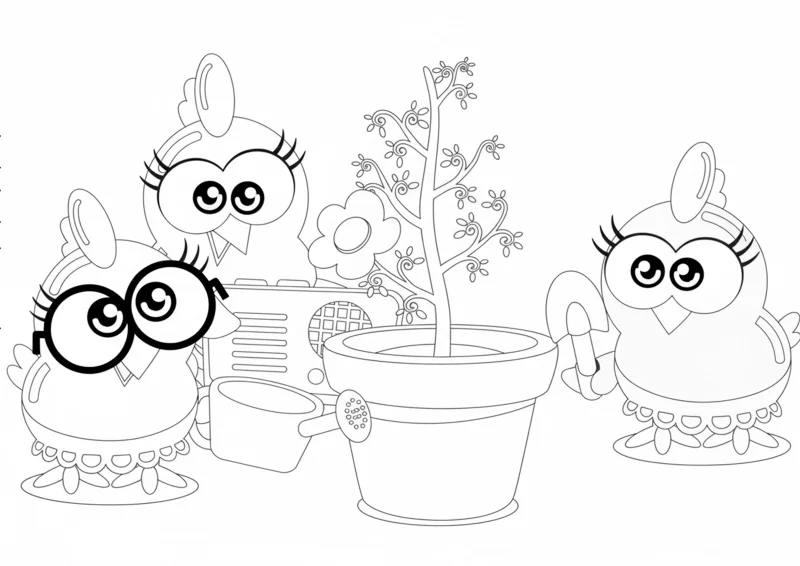 🐔Galinha PintadinhaDesenho para colorir das Galinhas Pintadinhas cuidando de um jardim com regador, vaso e flor. Uma delas usa óculos grandes, e todas demonstram alegria enquanto plantam e regam. Arte em preto e branco, traços limpos e expressivos no estilo Bob Goods, ideal para imprimir e incentivar a criatividade infantil e o amor pela natureza.