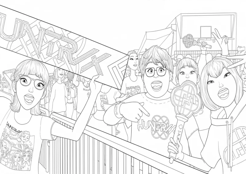 🗡️Guerreiras K-popDesenho ilustrado mostrando fãs das HuntRix vibrando em um grande show de K-Pop, segurando lightsticks e banners durante a turnê mundial. A cena transmite emoção, união e a forte conexão entre as guerreiras do K-Pop e seu fandom apaixonado.