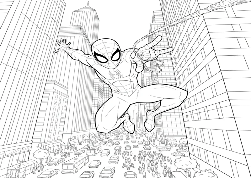 🕷️Homem AranhaIlustração em preto e branco do Homem-Aranha balançando entre os arranha-céus de Nova York com sua teia, em perspectiva dinâmica sobre uma avenida movimentada com carros e pedestres. Arte em estilo line art perfeita para colorir ou usar em projetos criativos.