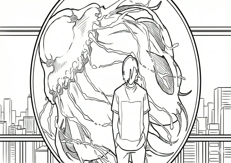 ⛩️Jujutsu KaisenDesenho para colorir de Junpei Yoshino com seu shikigami Moon Dregs (Sedimentos da Lua) ao fundo. A ilustração em estilo line art exibe o personagem e a invocação com traços nítidos em preto e branco, ambientados em um cenário urbano.