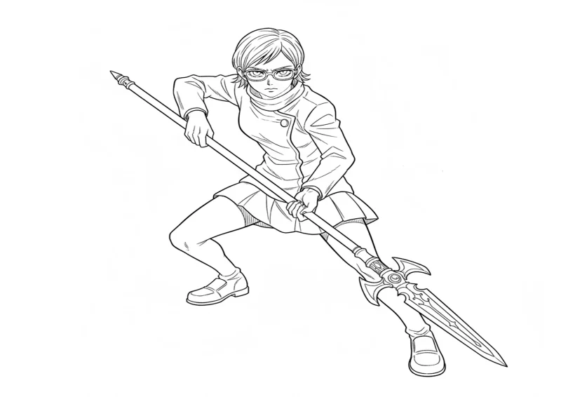⛩️Jujutsu KaisenMaki Zenin em posição ágil, segurando uma longa lança amaldiçoada.