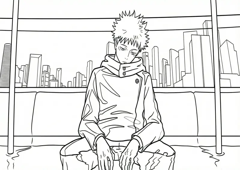 ⛩️Jujutsu KaisenDesenho de Megumi Fushiguro sentado com expressão introspectiva. A ilustração detalhada apresenta um fundo urbano pela janela e reflexos de água no chão, remetendo à sua técnica das sombras. Estilo line art preto e branco pronto para pintar.