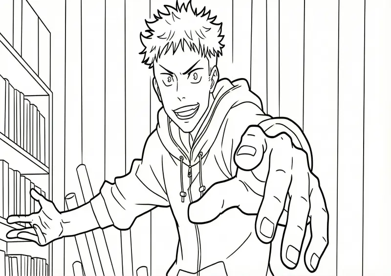 ⛩️Jujutsu KaisenDesenho para colorir de Yuji Itadori em uma pose dinâmica com a mão estendida em perspectiva. Ilustração de anime com fundo de estantes de livros, traços nítidos em preto e branco ideais para atividades de pintura.